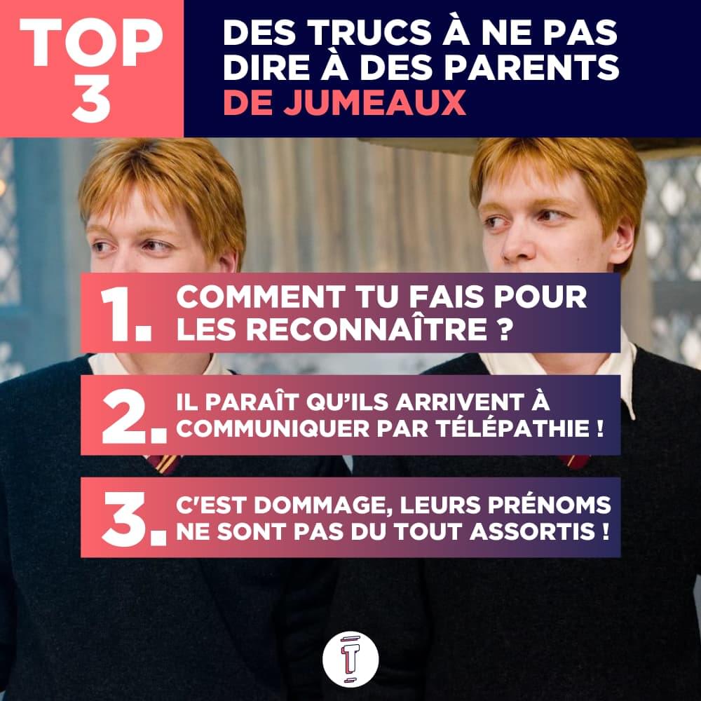 On avait déjà essayé d'imaginer les prénoms à ne pas donner à des jumeaux, mais on s'est rendu compte que des parents n'avaient aucun scrupule à donner les pires prénoms à leurs paires de gosses (quand ils ne choisissent pas tout simplement des prénoms affreux, genre Brunehilde et Cynthia). On dirait qu'ils font tout pour que les enfants partent avec le moins de chances possibles dans la vie, comme si c'était pas déjà assez compliqué d'avoir un frère ou une sœur qui a le même anniversaire et la même tête que soi.