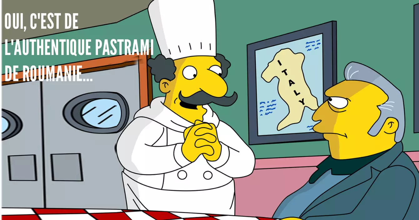 Voilà un autre « faux ami » ! Avec son nom à consonance italienne, le pastrami est en réalité roumain (pastramà, du verbe p?stra, qui signifie conserver). Il consiste grossièrement en une préparation de viande de bœuf marinée dans de la saumure puis fumée. Indispensable à l'époque où les frigos n'existaient pas pour conserver la bidoche, il demeure aujourd'hui tout simplement car il est délicieux. Des restaurants comme le Kats's Deli à New York (qui fut créé par un russe) en ont fait leur spécialité.