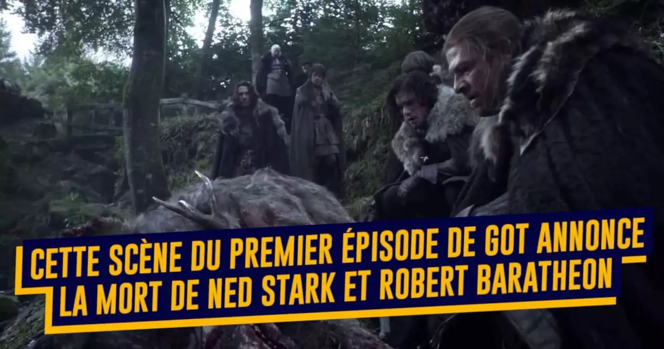 Lors d'une scène du tout premier épisode de la série Ned Stark trouve un cerf et un loup géant morts sur le côté d'un chemin, puis il décide de donner les bébés loups orphelins à chacun de ses enfants. Ça ne vous fait penser à rien d'autre ? Le cerf est l'emblème de la maison Baratheon et le loup celui de la famille Stark, et à la fin de la saison les deux chefs de ces maisons sont morts et les enfants Starks sont orphelins. C'est plus clair ?