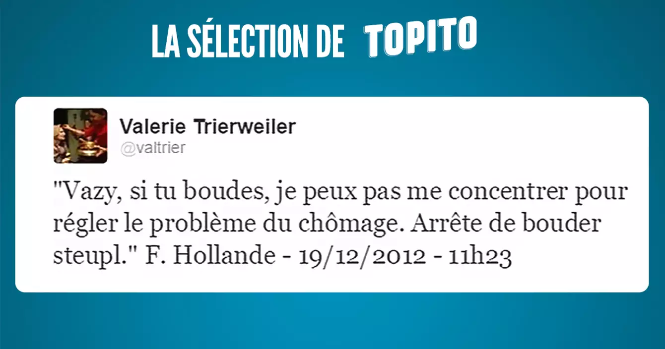 Alors que Valérie Trierweiler commence à balancer sec sur Hollande en publiant sur Twitter des SMS que le Président lui a envoyés, on a décidé de compiler les prochains tweets de l'ancienne Première dame pour vous offrir en exclusivité des infos croustillantes sur les coulisses d'une Présidence. Ci-dessous le SMS original, et juste après nos petites inventions.