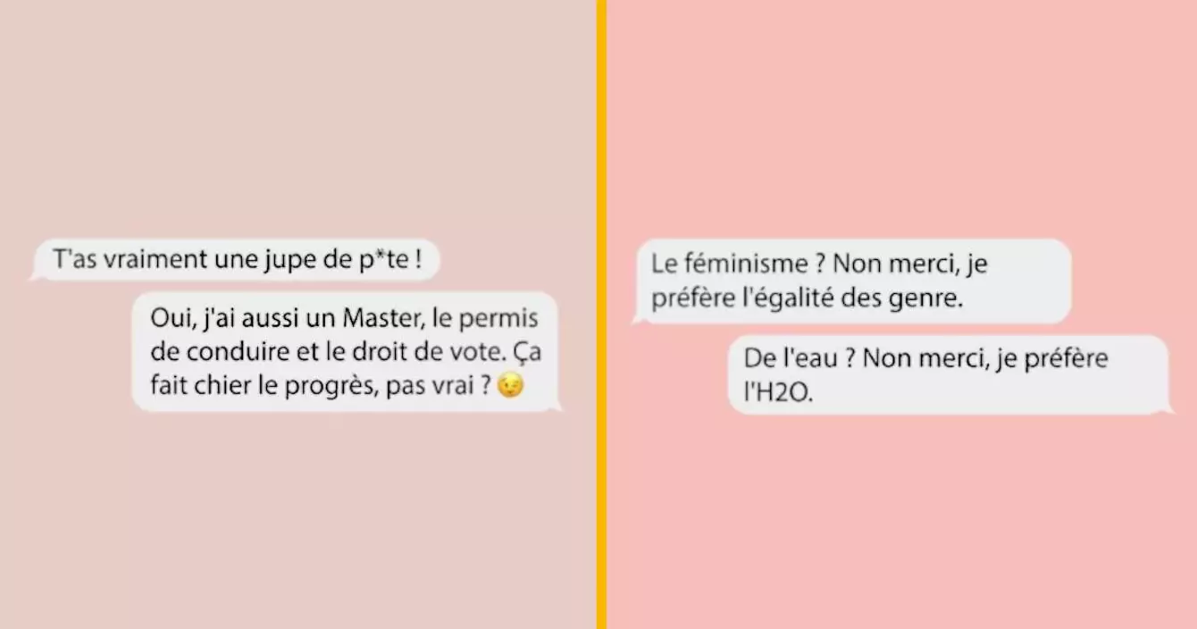 Il y a quelques semaines on vous avait montré quelques réparties pour s'en sortir face à des remarques sexistes. Mais en quelques semaines, malheureusement, le sexisme n'a toujours pas disparu (grosse surprise). Alors on a décidé de remettre une couche de bonnes réparties pour faire chier les sexistes. Voilà les meilleures punchlines de Punchlinettes, le compte Insta qui donne les meilleures réponses à des sexistes sous forme de messages. Et oui, on sait, il n'y a pas que les mecs qui sont sexistes, et il n'y a pas que les meufs qui sont victimes de sexisme, du coup on a mis quelques exemples qui changent un peu.