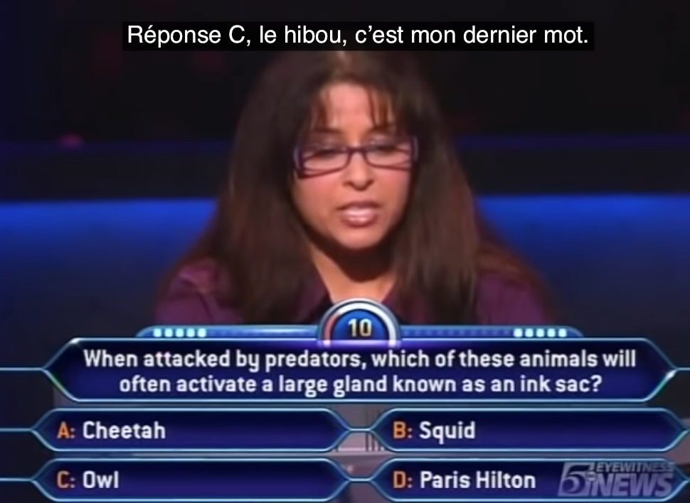 En soi, on peut ne pas avoir la réponse directement. Mais les propositions sont : une chouette, Paris Hilton (???), un singe ou une pieuvre.