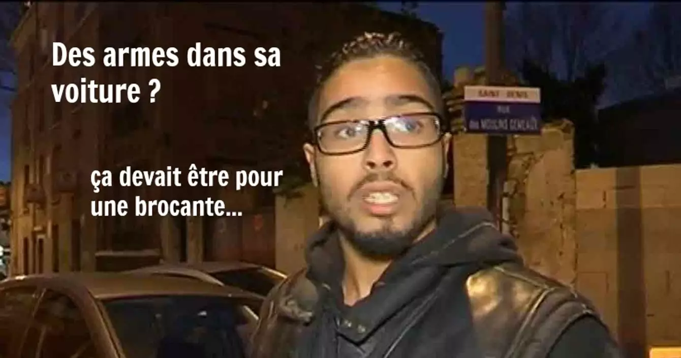 On apprend qu'un homme placé sous mandat d'arrêt dans les attentats de Paris et qui aurait transporté un des terroristes clefs avaient également des armes de poing et un pistolet d'alarme dans sa voiture. Mais bon rien de grave selon son avocat, c'était juste pour « faire des brocantes » (sic). L'occasion pour nous de filer un coup de main aux avocats en réfléchissant aux 50 autres exemples bidons pour justifier la présence d'armes à l'arrière de sa caisse. Et quand on y pense, elles marchent toutes.