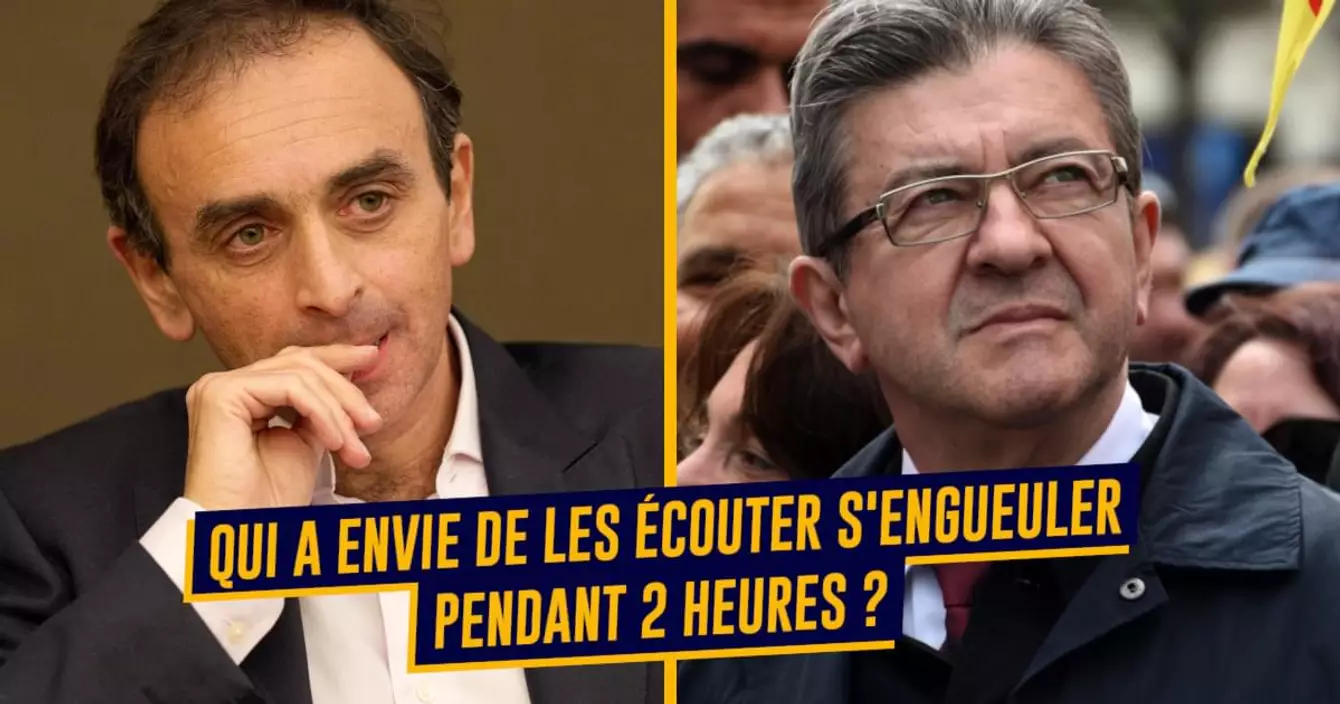 Ce soir, sur BFM TV, c'est le choc des extrêmes : Jean-Luc Mélenchon et Eric Zemmour seront présents sur le plateau pour débattre de tout un tas de sujets d'actualité. On va donc avoir deux personnes avec des idées radicalement différentes qui vont se prendre la tête en direct puisque, de toute façon, elles ne seront jamais d'accord. Ça s'annonce bien pourri. Nous on vous conseille de ne pas regarder.