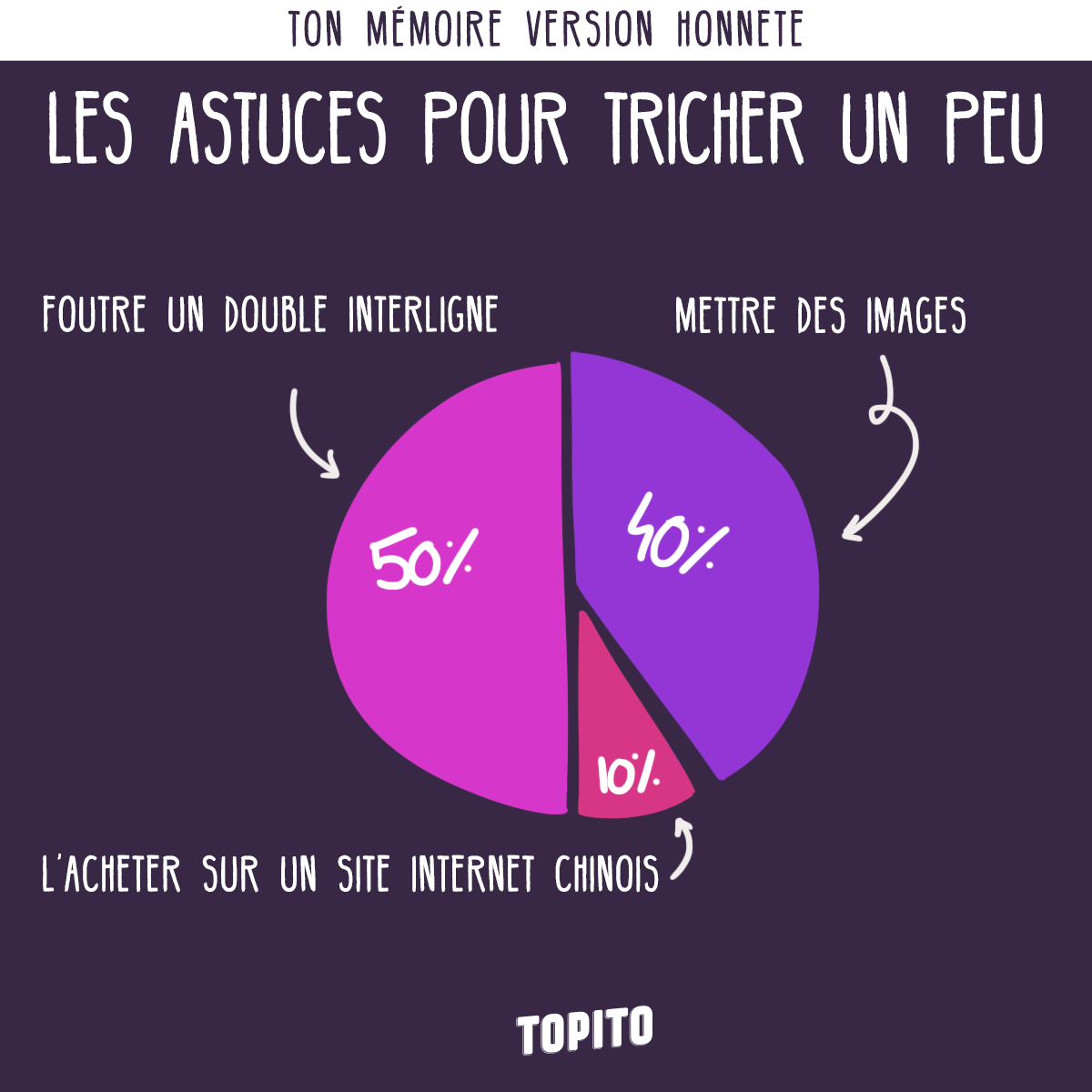 Si vous êtes ce que j'appelle communément des « grands malades qui ont eu la déter de se taper 5 ans d'études », vous êtes forcément passés par la case « je m'enferme 6 mois dans ma chambre, je branle rien pendant 5 mois et demi et les deux dernières semaines je ne dors plus parce que j'suis submergé par le taf ». On appelle ça aussi la case « mémoire ». Chez Topito, on sait comment écrire beaucoup pour dire pas grand chose, on vous a déjà donné des astuces pour broder sur votre mémoire, y'a même une vidéo très drôle sur l'impression du mémoire. Mais pour l'instant, on en est pas là, nous on veut surtout faire une pétition pour supprimer les mémoires de fin d'études, et j'ai donc listé nos motivations. N'hésitez pas à l'envoyer à l'Education Nationale pour les motiver hein, on sait jamais, j'vais peut-être lancer un mouvement.