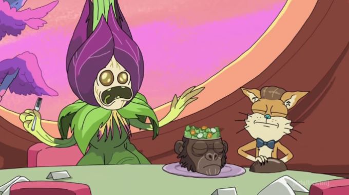 Non ce n'est pas le chat ni la fleur, mais la tête de singe dans laquelle on peut manger un merveilleux repas. Ok tu as vu le film il y a longtemps, mais fais appel à ta mémoire jeune padawan.