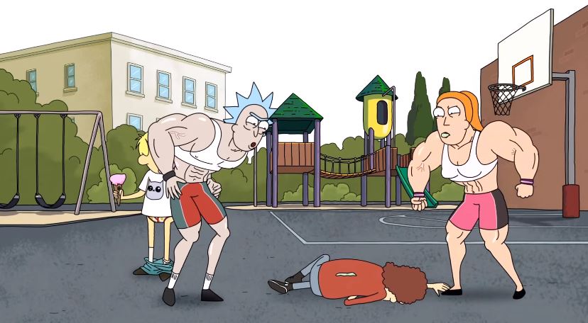 On voit cette scène dans la scène post-générique, quand Rick et Summer deviennent hyper musclés et pètent la gueule de personne peu sympathiques. Le personnage qui se fait démonter ressemble à Randall Weems de la série La cour de récré.
