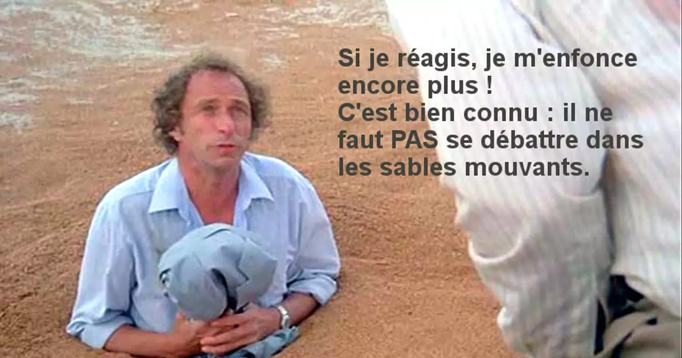 - Si je réagis je m’enfonce encore plus, c’est bien connu, faut pas se débattre dans les sables mouvants.