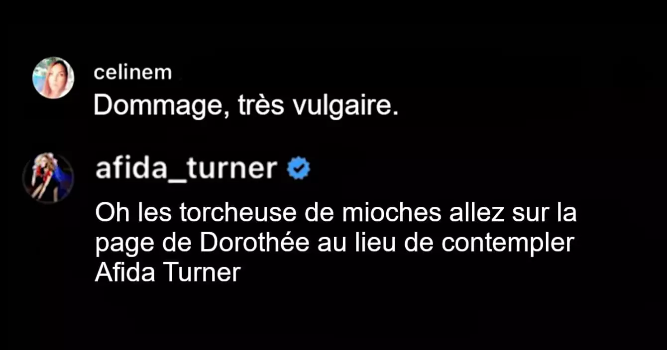 Il y a des tas de raisons de vénérer Afida Turner, notre meilleure chanteuse française, et aujourd'hui on vient d'en trouver une nouvelle : sur Insta, Afida est une tueuse. Dès que quelqu'un essaie de la clasher, elle clash à son tour avec une répartie sans pareille. Elle est tellement forte que le compte Don't mess with Afida a répertorié il fut un temps ses meilleures réponses pour notre plus grand plaisir. Le compte n'est plus très actif mais ce n'est pas une raison pour ne pas se replonger dans ses plus belles trouvailles. Oubliez Cyrano de Bergerac, Edouard Baer ou Laurent Baffie, les meilleures répliques c'est chez Afida qu'on les trouve.