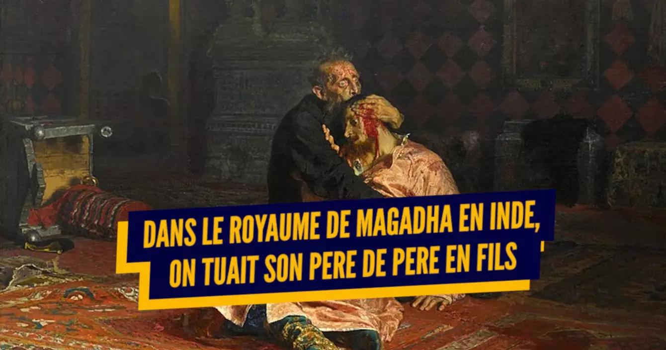 Le parricide de père en fils, c'est une tradition dans le royaume du Magadha, en Inde. Prenez Bimbisara, qui a régné entre 543 et 491 avant JC. Premier roi du coin, Bimbisara a fait des alliances avec les autres mecs du coin pour garantir la paix, mais s'est retrouvé emprisonné par son propre fils, Ajatashatru et est mort de faim. Mais ce qui est marrant, c'est que le Ajatashatru en question, qui a donc régné sur le même royaume entre 492 et 460 avant JC s'est lui aussi fait zigouiller par son fils, qui lui s'appelait Udayabhadra. Tel est pris qui croyait prendre.