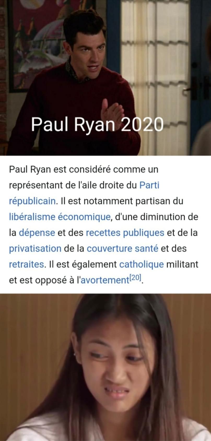 Quand Jess et Cece aident pour la campagne d'Hillary Clinton dans la saison 6, Schmidt dit qu'aucun candidat ne l'intéresse cette année mais qu'il attend avec impatience 2020 afin de voter pour Paul Ryan. Alors bon, on se doutait que Schmidt était de droite mais de là à vouloir voter pour Paul Ryan…