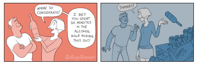 « Ouah ! C'est tellement gentil ! - Je parie que tu a passé 20 minutes au rayon alcool pour choisir ça ! » - « Merci »