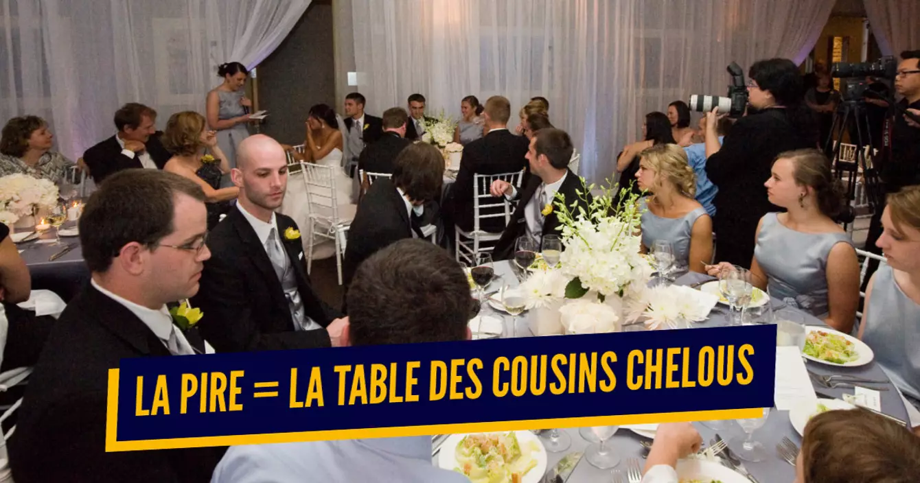 Si tu veux êtres interrompu toutes les cinq secondes pendant que tu manges par des gens qui te bousculent afin de dire leur petit mot aviné aux mariés, c'est the place to be. En plus, faut surveiller ton alcoolémie, sans quoi tu vas te retrouver à vomir sur une belle robe blanche ou à draguer la mauvaise personne. Bref, la pire place du monde, celle où tu as le sentiment d'être filmé. N'essaie même pas de te curer le nez.