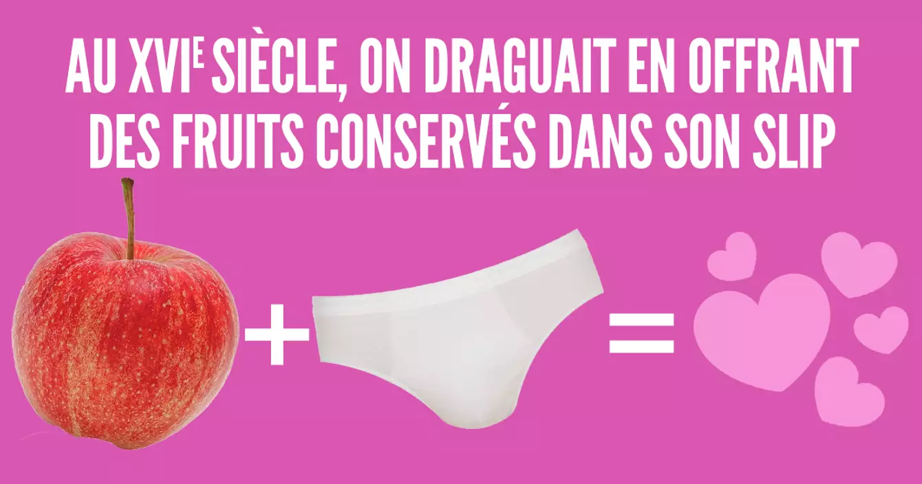Au XVI° siècle, il était de coutume d’offrir à l’élue de son cœur des fruits pochetés, c’est-à-dire amoureusement tiédis dans son slip. Étonnamment, cette coutume n’est plus en vogue.