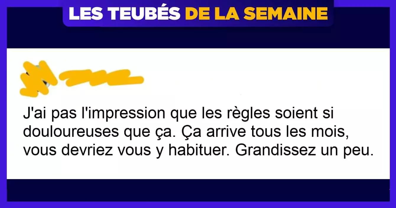 « J'ai pas l'impression que les règles soient si douloureuses que ça. J'ai l'impression que tu dois juste grandir et t'y habituer. Pleurer pour ça ne sert à rien… »