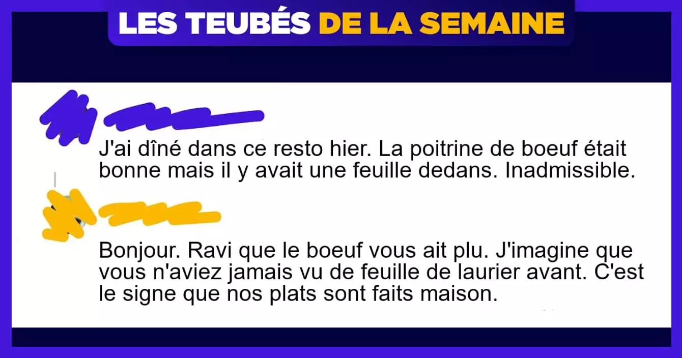 Critique de resto par un teubé : « J'ai mangé là pour la première fois ce soir. La poitrine de bœuf était probablement la meilleure que j'aie jamais mangée mais j'ai trouvé une FEUILLE entière dans mes haricots. Ça ne s'invente pas. »