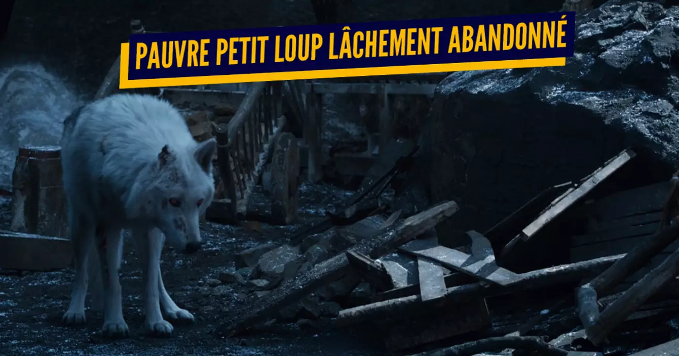 Le 'ti chien a toujours été là pour Jon et les Stark. Et voilà comment il est remercié : Jon le refile gratos à Tormund. Pauvre 'ti toutou, j'étais trop triste.