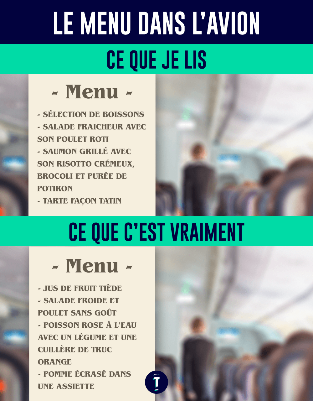 La meilleure façon de manger, c'est encore la nôtre, c'est d'éviter l'avion et de ne pas voyager ! (Sur l'air de « Dans la troupe », s'il vous plait.)