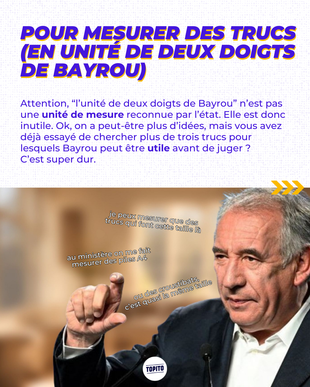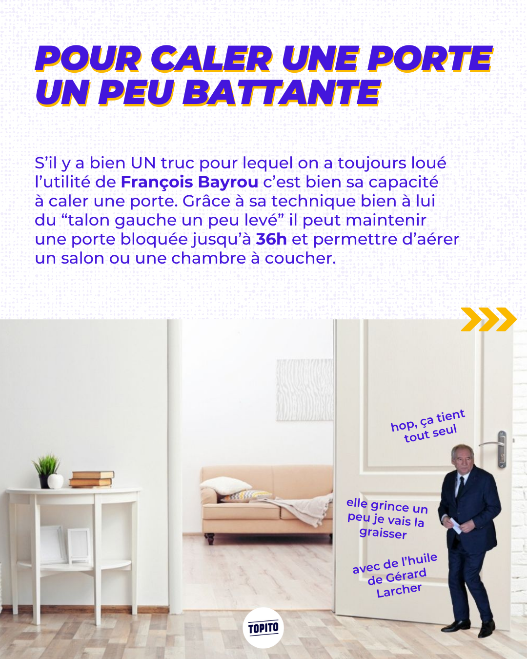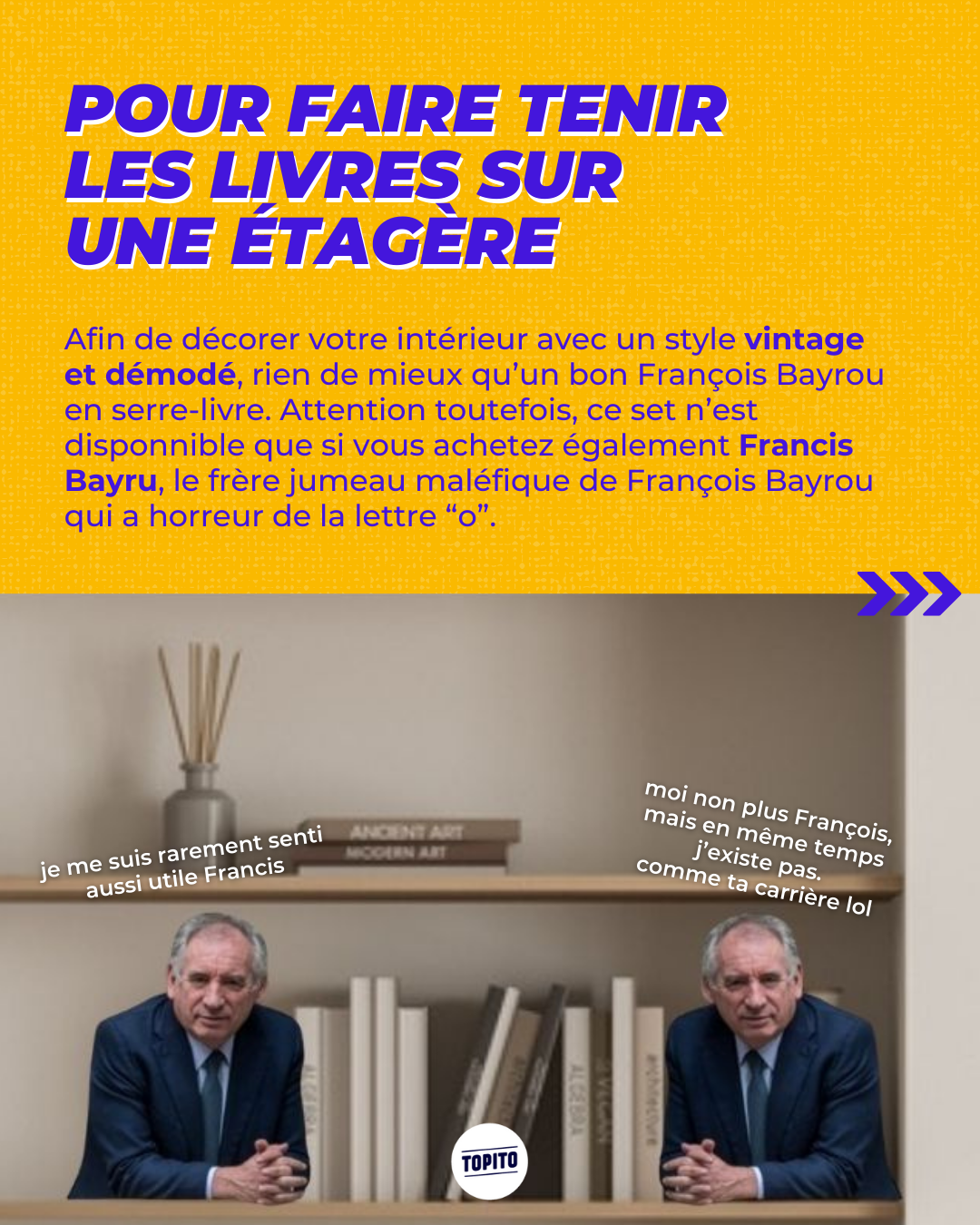 François Bayrou est premier ministre. Et nous sommes en 2025. Voilà, vous aviez peut-être oublié à quel point ces deux informations s'associent aussi bien que l'huile et l'eau mais c'est pourtant la vérité. Quoi qu'il en soit, on a essayé de chercher à quoi ce brave monsieur pourrait être plus utile qu'à son poste ou en politique au sens large. Et c'était super dur. Pas parce qu'il est très bon en premier ministre, juste parce qu'on a aucune idée de ce qu'il peut faire bien. C'est d'ailleurs pour ça qu'on a trouvé que huit idées et pas dix. Mais quand même, on a cherché.