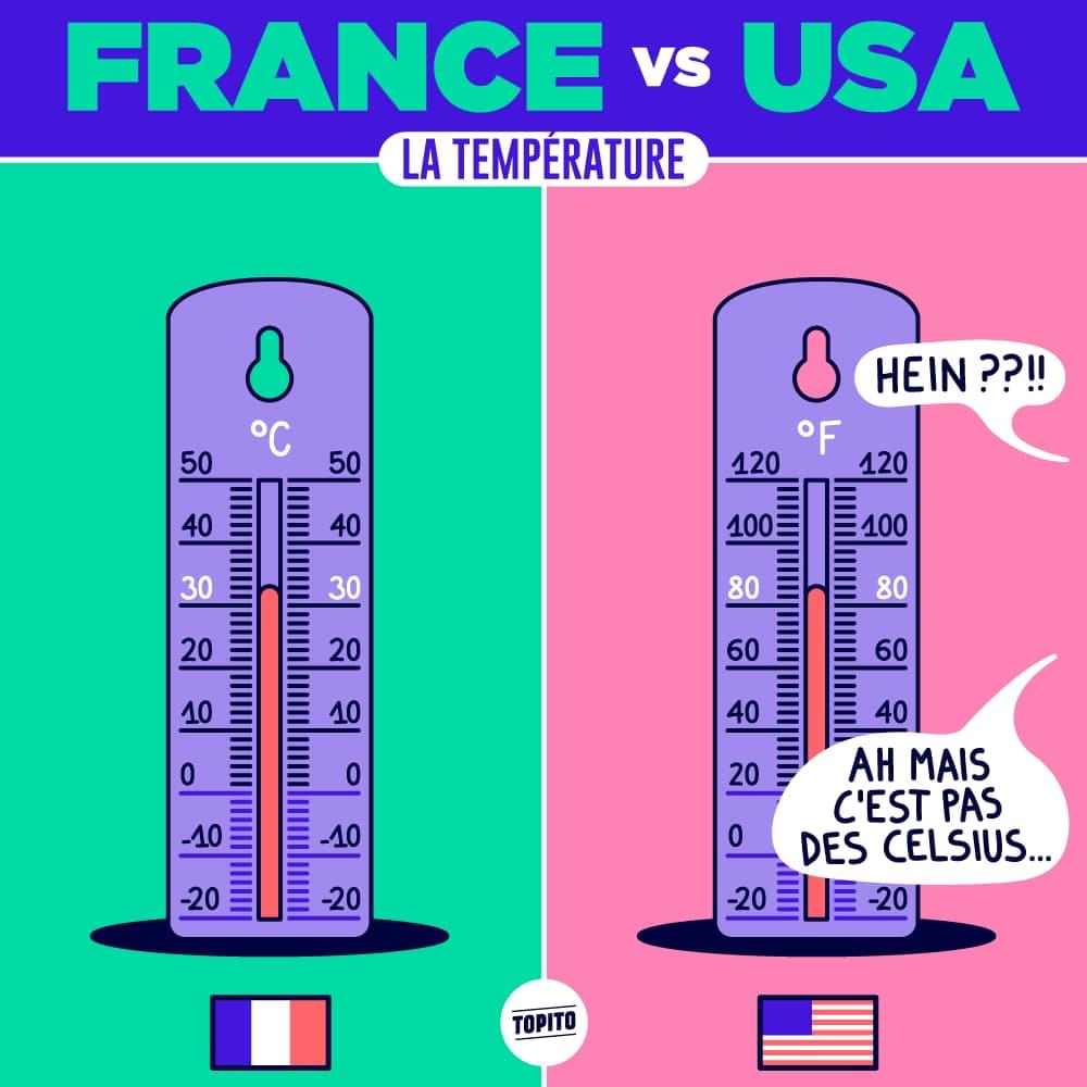 Seuls les USA, les Îles Caïmans, le Liberia et le Belize ont adopté ce système. Au Canada, on peut l'utiliser comme échelle complémentaire. Utiliser les Celsius outre Atlantique, c'est nope. Partout ailleurs, c'est normal.