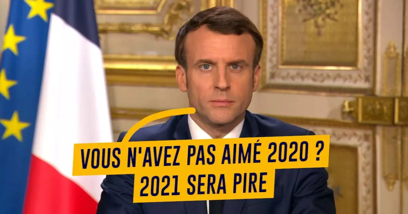 Ça y est, cette année bien naze est bientôt terminée. On est passé par plein d'étapes en 2020 mais novembre était probablement le pire mois de 2020. Entre l'hiver qui s'installe, le reconfinement après un semblant de liberté et la lassitude envers ce connard de virus, on était vraiment au bout du rouleau. On a envie de penser que tout ça, c'est derrière nous, mais 2021 sera peut-être pire, qui sait ? (non, impossible). Et comme on n'a pas eu assez d'allocations présidentielles cette année, on attend avec impatience les vœux du poto Macron. On ne sait pas encore ce qu'il va nous raconter, mais on sait déjà ce qu'on ne va pas entendre (normalement).