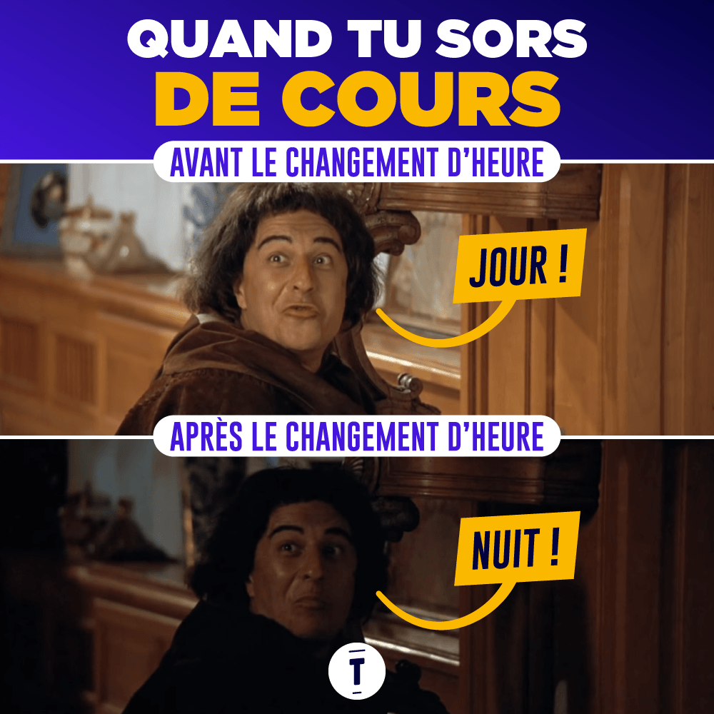 Evidemment tu revérifies la date, mais tu te demandes aussi si tu vas vraiment gagner une heure. Ou perdre une heure. Globalement, tu as toujours une chance sur deux d'être déçu.e. Voilà pourquoi je te renvoie vers nos meilleurs tweets sur le changement d'heure.
