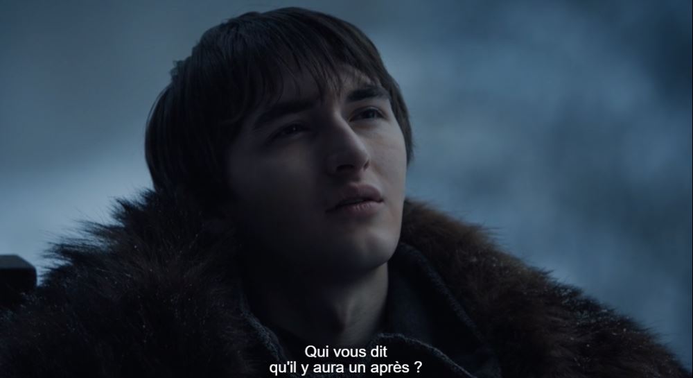 L'apéro se passait bien mais il manquait un truc : une grosse sono et des platines. Du coup c'est Podrick qui a dû assurer la musique et il nous a lâché un petit son a cappella. Seul problème : c'était tellement beau avec les images d'adieux derrière qu'on a tous chialé devant notre télé. Parce qu'au fond on sait très bien que la moitié des gentils va crever dans le prochain épisode.