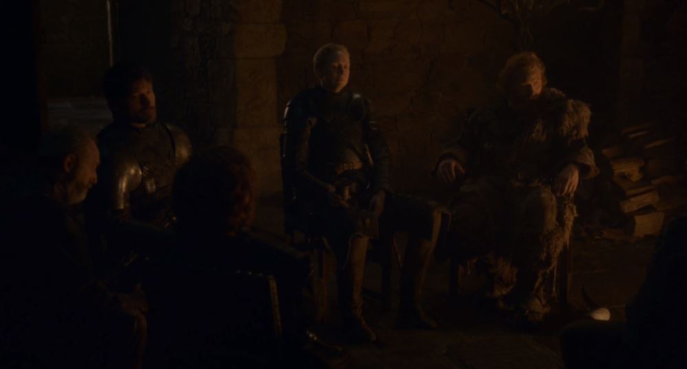 Jaime a finalement été accepté plutôt facilement à Winterfell, et pour fêter ça il a bu des coups avec Tyrion, Brienne, Podrick, Davos et Tormund. Des chaises et des pichets de vin, il en fallait pas plus pour s'ambiancer. Les mecs vont disputer la bataille de leur vie le lendemain et ils vont y aller avec une gueule de bois de l'enfer après avoir bu leur piquette toute la nuit. Hyper responsable.
