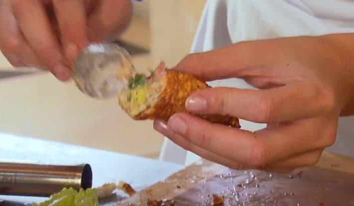 La pauvre Carla se tape un coup de stress parce qu'elle porte la brigade sur ses épaules. Mais même si elle stresse, sa recette a l'air de tout déglinguer : un cannolo de peau de poulet grillé fourré avec du bacon, une salade de poulet et de la mayo. On signe direct.