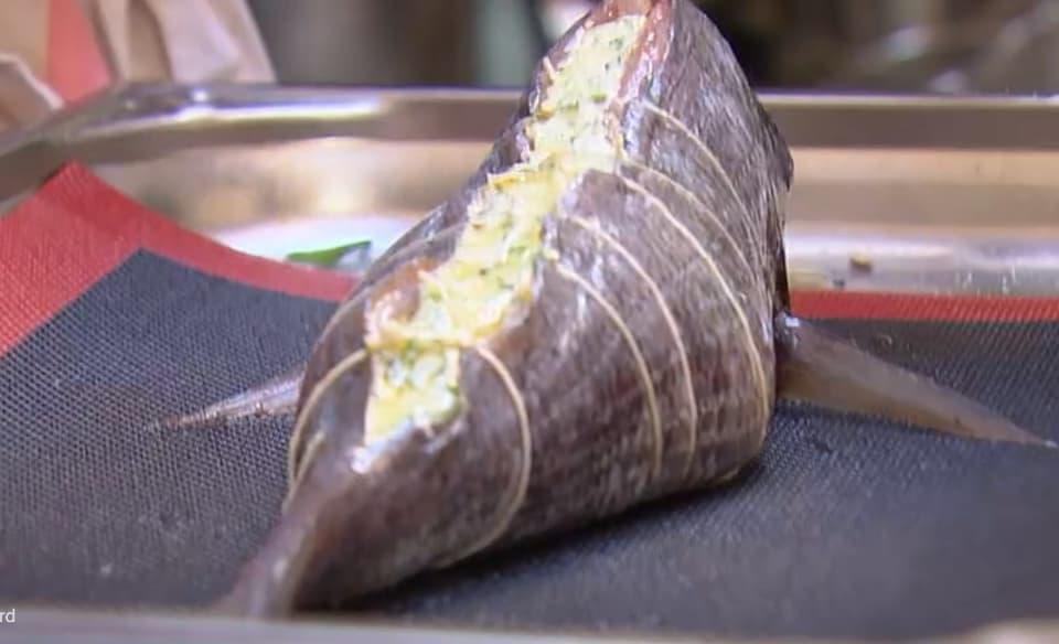 La dorade farcie arrive pour être découpée et on peut déjà se dire qu'une dorade cuite ça a un peu une sale gueule, mais oublions rapidement ce détail peu ragoûtant, les chefs ont l'air vraiment conquis par le taff de Hugo, on doit même arrêter le chef Billard qui commence à manger l'assiette à pleine dents. La vaisselle lui sera facturée.