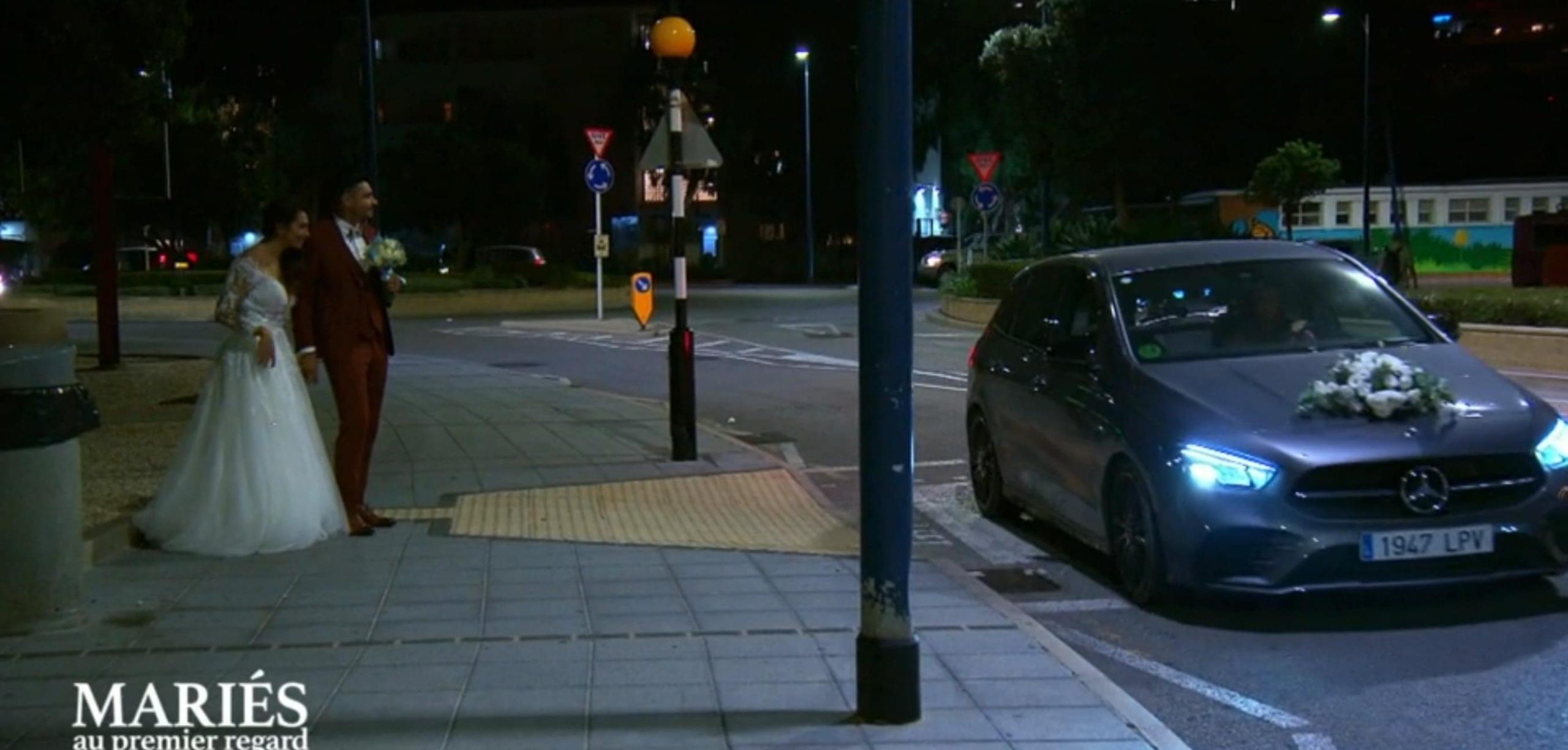 Damien et Pauline en voyant la voiture avec un bouquet de fleurs sur le capot : « c'est la nôtre ? »