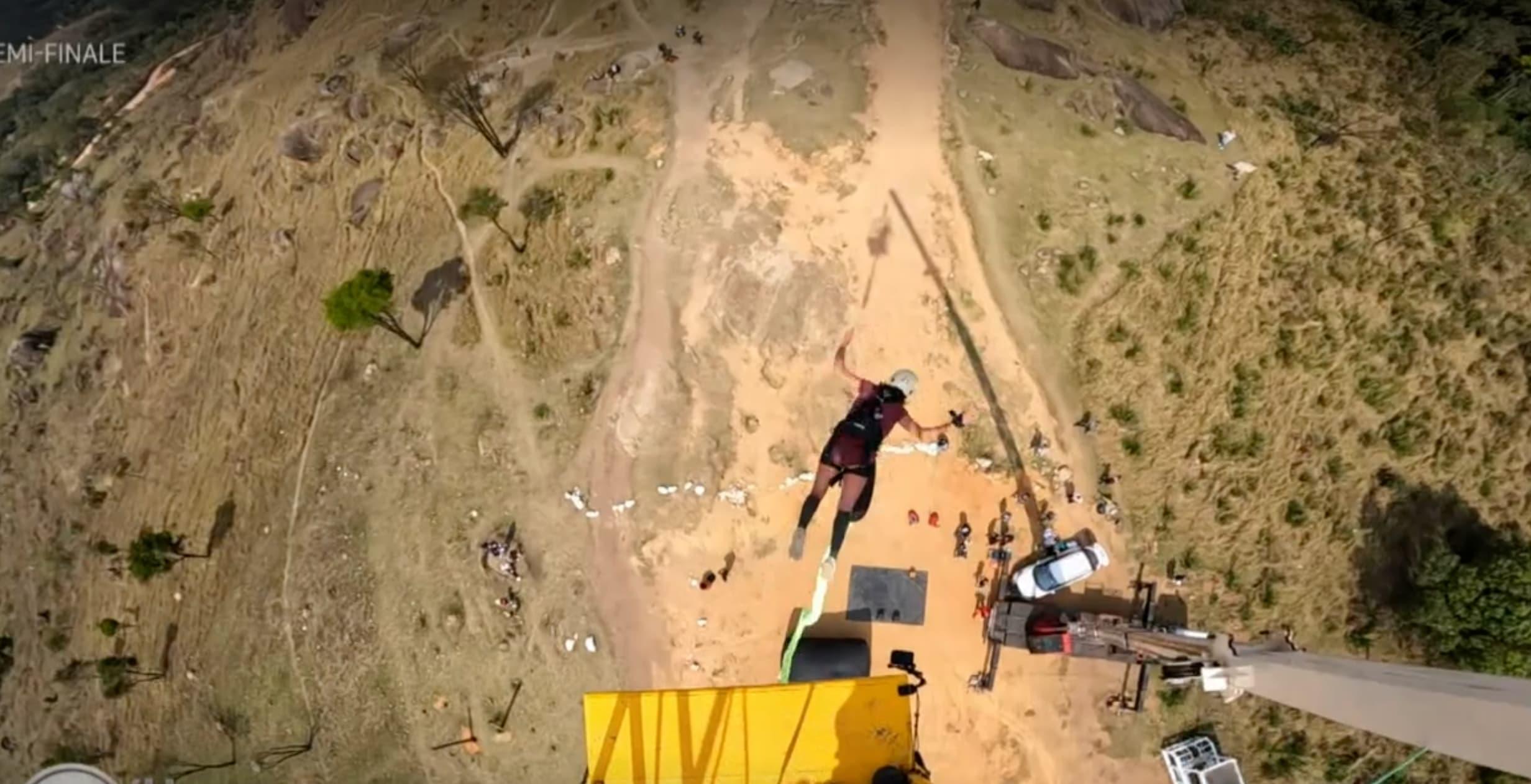 Vous vous souvenez, en première semaine, quand Alexandre n'avait pas réussi à faire de la tyrolienne à cause de sa phobie du vide ? Imaginez son état si on lui demande de sauter à l'élastique, depuis 50 m de hauteur. C'est un peu la même situation pour tous puisque dans chaque binôme, un des candidats n'arrive pas à faire l'épreuve.