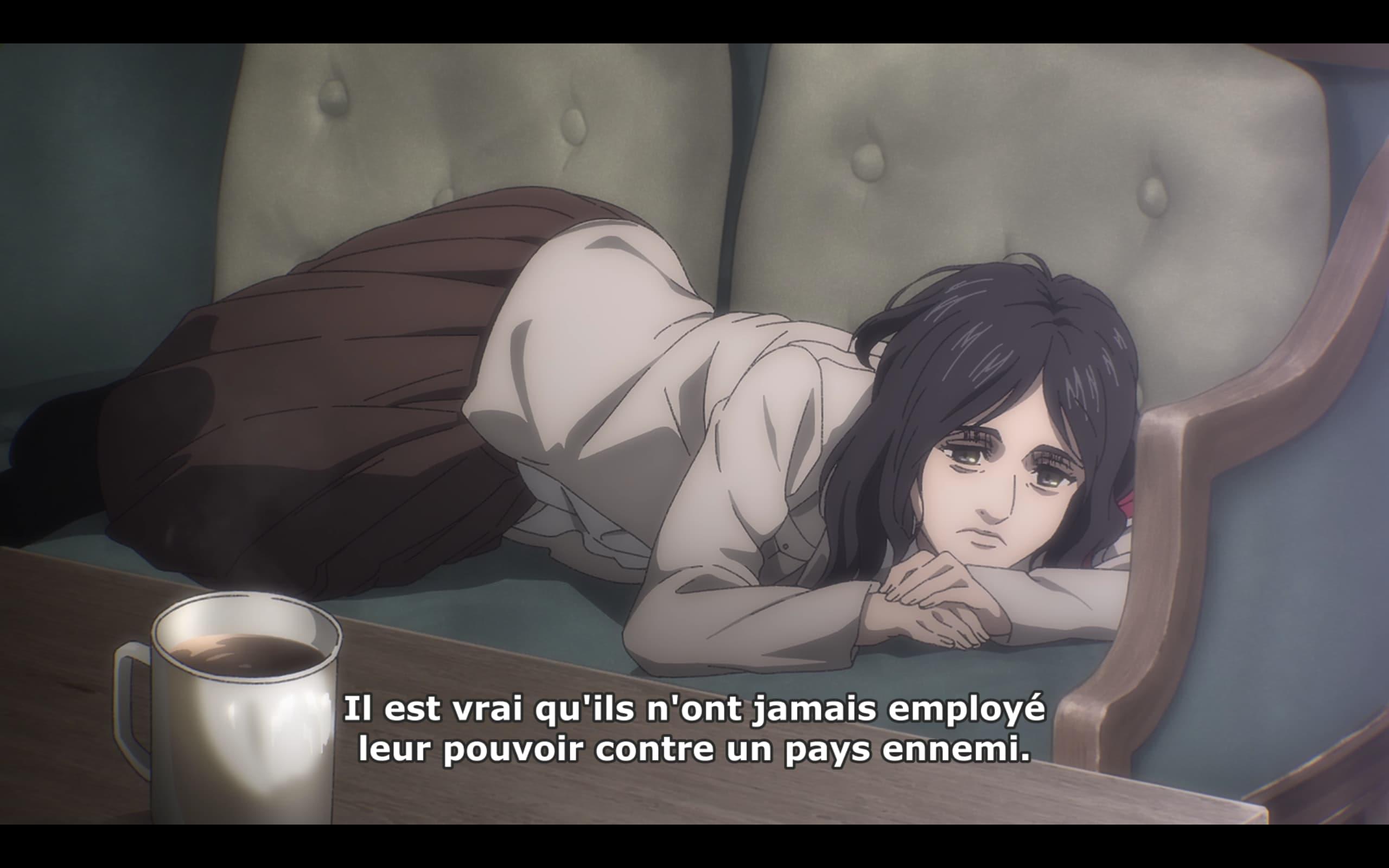 Tu veux le Titan Mâchoire ? Très bien je te l'offre. On apprend que Ymir a volontairement offert son Titan à Galliard. Bon dans le flashback on voit qu'elle n'a plus aucune volonté de vivre la pauvre. Mais ça reste sympa d'avoir Ymir comme Secret Santa puisqu'elle te donne un putain de Titan.