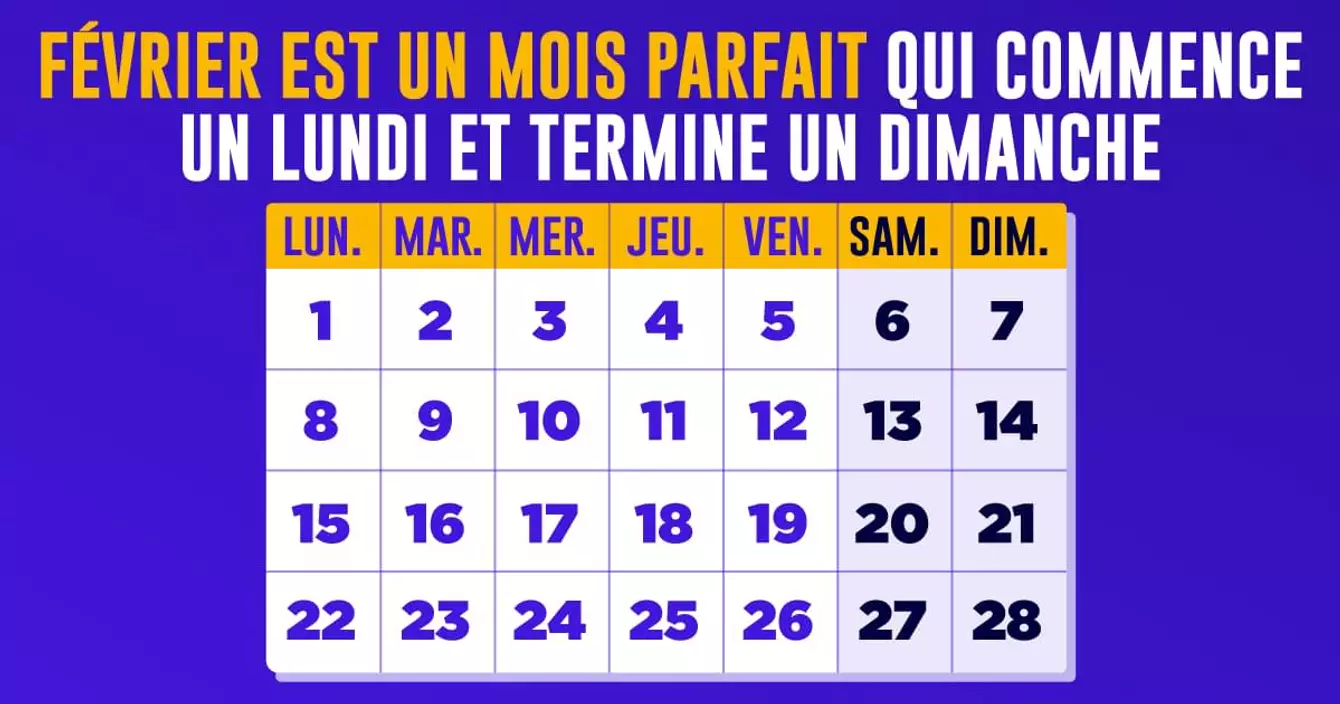 Cette année, le mois de février est un mois parfait. Il a 28 jours, ce qui fait pile quatre semaines, il commence un lundi et finit un dimanche. Quand je regarde le calendrier, ce mois réveille des émotions nouvelles en moi, une sorte d'apaisement. Ce sera forcément un mois génial, non ?
