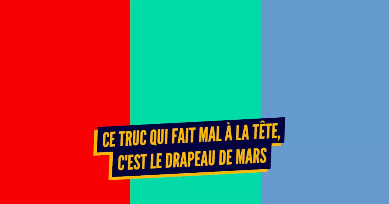 Le poids des mots, le choc des photos. Le drapeau n'a aucune valeur officielle et sert surtout de propagande pour les organismes de recherche scientifique. Le rouge y symbolise Mars dans sa version actuelle, le vert et le bleu correspondant aux couleurs que pourraient prendre la planète si on y faisait plein d'ajustements en vue de la coloniser.