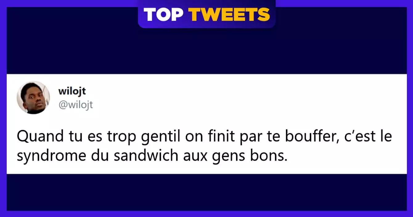 Quand t'as la dalle et que t'as la flemme (genre vraiment la flemme, genre même pas le temps pour faire des pâtes), le meilleur plat c'est le sandwich. Rien de plus simple : du pain et des trucs dedans. Charcuterie, poulet, légumes, thon, saumon, mayo, beurre, clous de girofle, PQ, télé 4K, lampe de chevet… tu peux vraiment mettre TOUT ce qui te passe par la tête dans un sandwich. Finalement, c'est le plat parfait et il mérite bien son top tweets. Même le club sandwich d'aire d'autoroute.