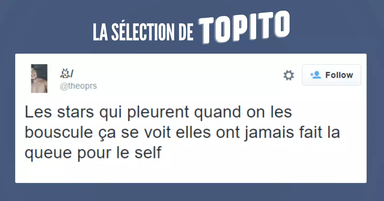 Samedi soir avec Burnain on est allé tourner une petite vidéo dans des bars parisiens (on voulait rencontrer des rugbymen saouls) et je suis tombé sur une fille très sympa (et complètement saoule) qui m'a dit « Maiiiis j'adore votre top des tweets le lundiiiii ». Elle m'a aussi dit « Ehhhheehehehehe » et « je suis pas bien ça tourne je crois je vais vomir ». Eh bien voilà, ce top 20 des meilleurs tweet de la semaine #93 t'es dédié, bravo ma biche !