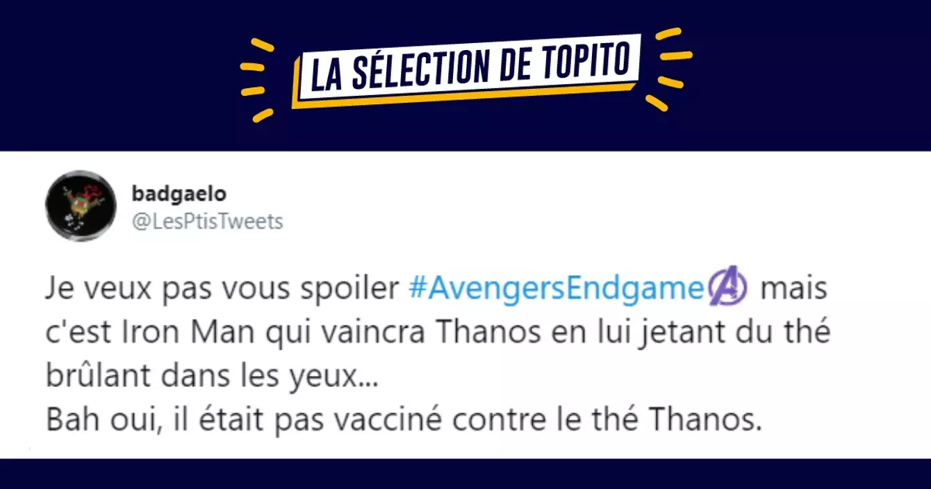 Je veux pas vous spoiler #AvengersEndgame mais c'est Iron Man qui vaincra Thanos en lui jetant du thé brûlant dans les yeux... Bah oui, il était pas vacciné contre le thé Thanos.