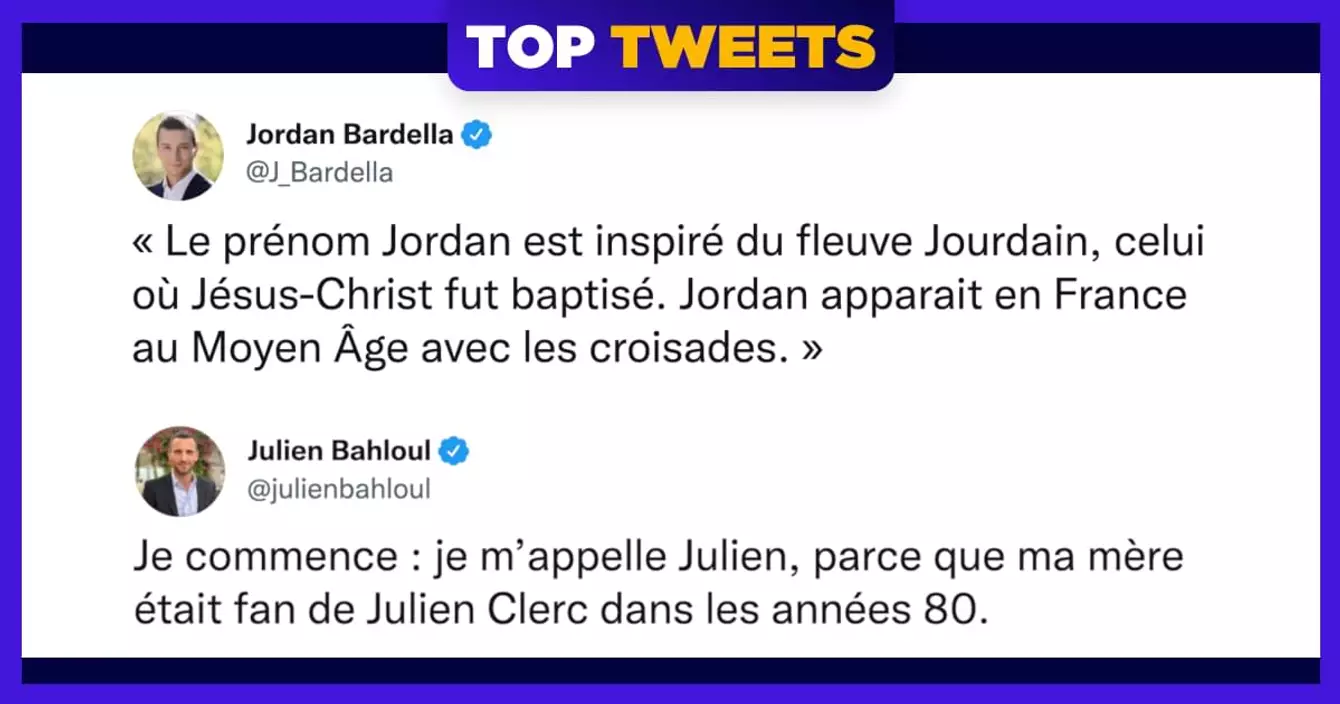 Bonjour alors voilà en fait il y a quelques jours Zemmour a expliqué que les prénoms Kévin et Jordan étaient relous parce qu'ils témoignaient d'une américanisation de notre société, et ça a agacé Jordan Bardella du RN qui a expliqué que son prénom avait pour origine le fleuve Jourdain dans lequel Jésus a été baptisé et qu'il y avait déjà des Jordan au Moyen-Âge. Forcément, plein de gens se sont foutus de sa gueule sur Twitter et ont commencé à expliquer les origines de leur prénom à la manière de Jordy l'extrémiste. C'est parti pour le fun de droite.