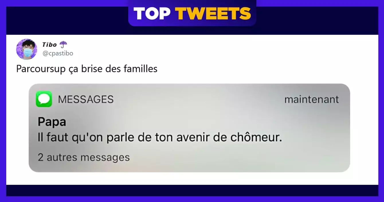 Les lycéens ont reçu leurs premières réponses sur Parcoursup, la plateforme qui sert à candidater pour des établissements d'études supérieures. Et, comme on l'avait déjà vu dans les tweets sur Parcoursup, cette plateforme c'est une grosse galère, mais surtout une énorme source de déception quand tu te tapes des « refusé » de partout. Comme si, à la fin d'une année scolaire particulièrement reloue, t'avais besoin d'encaisser des gros STOP qui font bien mal. Heureusement, ceux qui se font recaler (ils sont nombreux) ont de l'humour et ils ont fait des tweets très drôles pour le prouver.