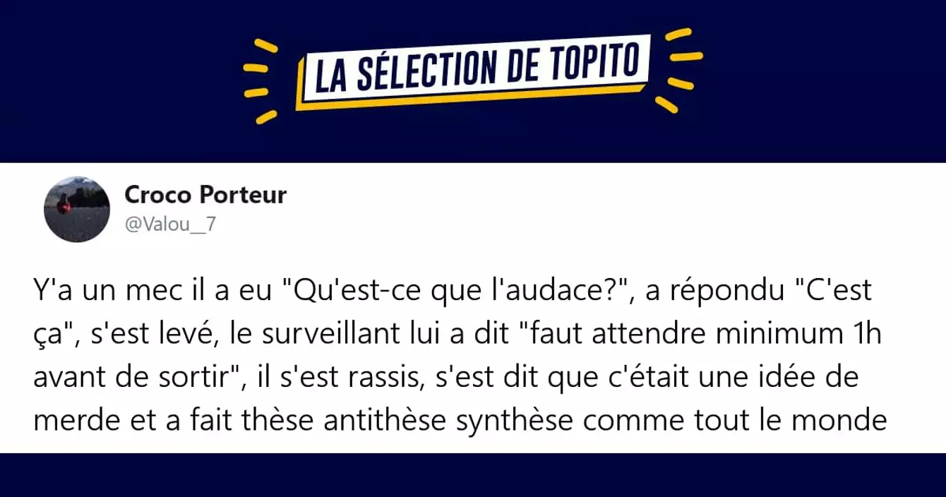 Tout le monde a déjà entendu cette légende urbaine. Un de vos potes connait quelqu'un qui connaît quelqu'un qui a eu comme sujet de philo : « Qu'est-ce que l'audace ? » et qui a juste écrit : « l'audace, c'est ça. » puis s'est tapé un 20/20. Aujourd'hui, quasiment tout le monde sait qu'il s'agit d'une légende urbaine, mais ça n'empêche pas certains de continuer à essayer de faire gober ça aux autres. Les twittos s'en sont moqués, et on a compilé les meilleures versions.