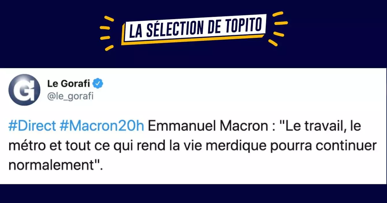 Ça y est, c'est le moment qu'on attend tous depuis lundi : Macron a enfin parlé. La dernière fois, ça n'avait pas donné grand chose de bon alors forcément, on s'est tous beaucoup méfiés. Il y a même eu beaucoup de prédictions en tweets sur l'allocution de Macron et mine de rien, on avait plein d'idées. Au final, on avait bien raison. Et bim, couvre-feu dans la gueule pour neuf métropoles (les bretons s'en sortent bien, comme toujours). En vrai, c'est sympa la vie entre 6h et 21h non ?