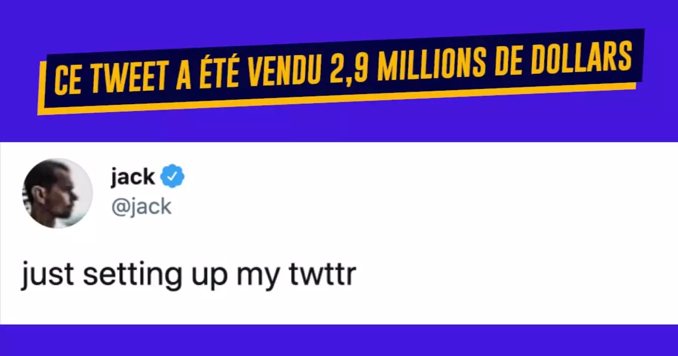 Voici le tout premier tweet de la plateforme, celui de Jack Dorsey, le créateur de Twitter. Après des semaines d'enchères, il a finalement été vendu à 2,915,835 dollars. Ça fait toujours plaisir d'empocher pareil montant.