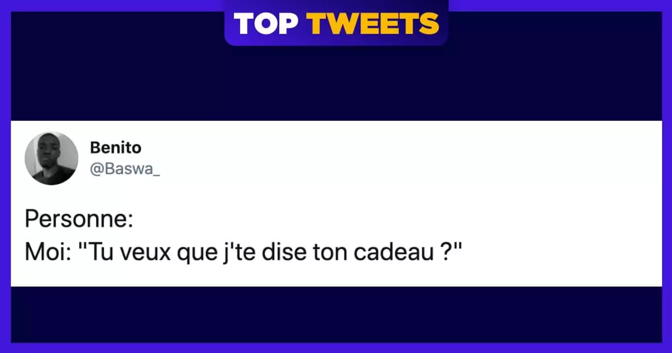 Salut les ptits potes, me revoilà pour vous offrir votre dose hebdomadaire de rigolade. Les tops tweets du confinement, c'est terminé et je sais que vous pleurez le soir dans votre lit mais dites-vous qu'il y aura sûrement une troisième vague et une ribambelle de tweets pour aller avec. Plus que trois jours avant le réveillon de Noël, j'espère que vous avez fait tous vos cadeaux de Noël même s'il n'est jamais trop tard pour acheter un truc inutile et amusant. Marrez-vous bien devant les meilleurs tweets de la semaine et bonnes fêtes de fin d'année !