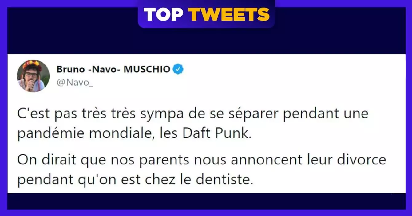 C'est officiel, les Daft Punk se séparent et c'est tout un monde qui s'écroule. Les fans chialent toutes les larmes de leurs corps et la twittosphère est encore plus en émoi que pour l'incendie de Notre-Dame (bonjour l'égoïsme). Heureusement, quelques plaisantins sont là pour nous remonter le moral après cette vidéo déchirante. Vive la République l'électro et vive la France.