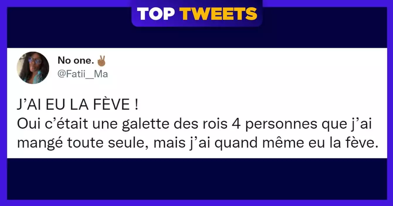 Si toi aussi tu aimes aller sous la table pour dire des prénoms de gens, si toi aussi tu enlèves le fruit confit rouge ou vert dégueulasse sur ta part, si toi aussi la frangipane c'est pas si mal mine de rien, si toi aussi la fève tu la découvres quand tu l'as dans la bouche, alors ce top tweets est fait pour toi. Force et honneur et Doliprane 1000.