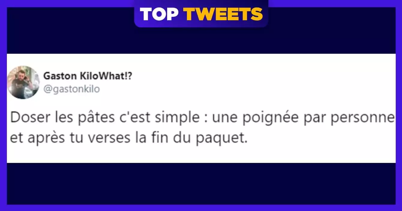 Il est 3h du matin, tu rentres de soirée. C'était cool, sauf au moment où le feu piéton était rouge alors que tu préfères le vert, ça va mieux avec ton teint violet (tu es un peu malade). Arrivé chez toi, tu as faim, alors tu manges le plat le plus facile à faire après la fabrication du ciment : les pâtes. Voici des tweets en lien avec cet aliment.