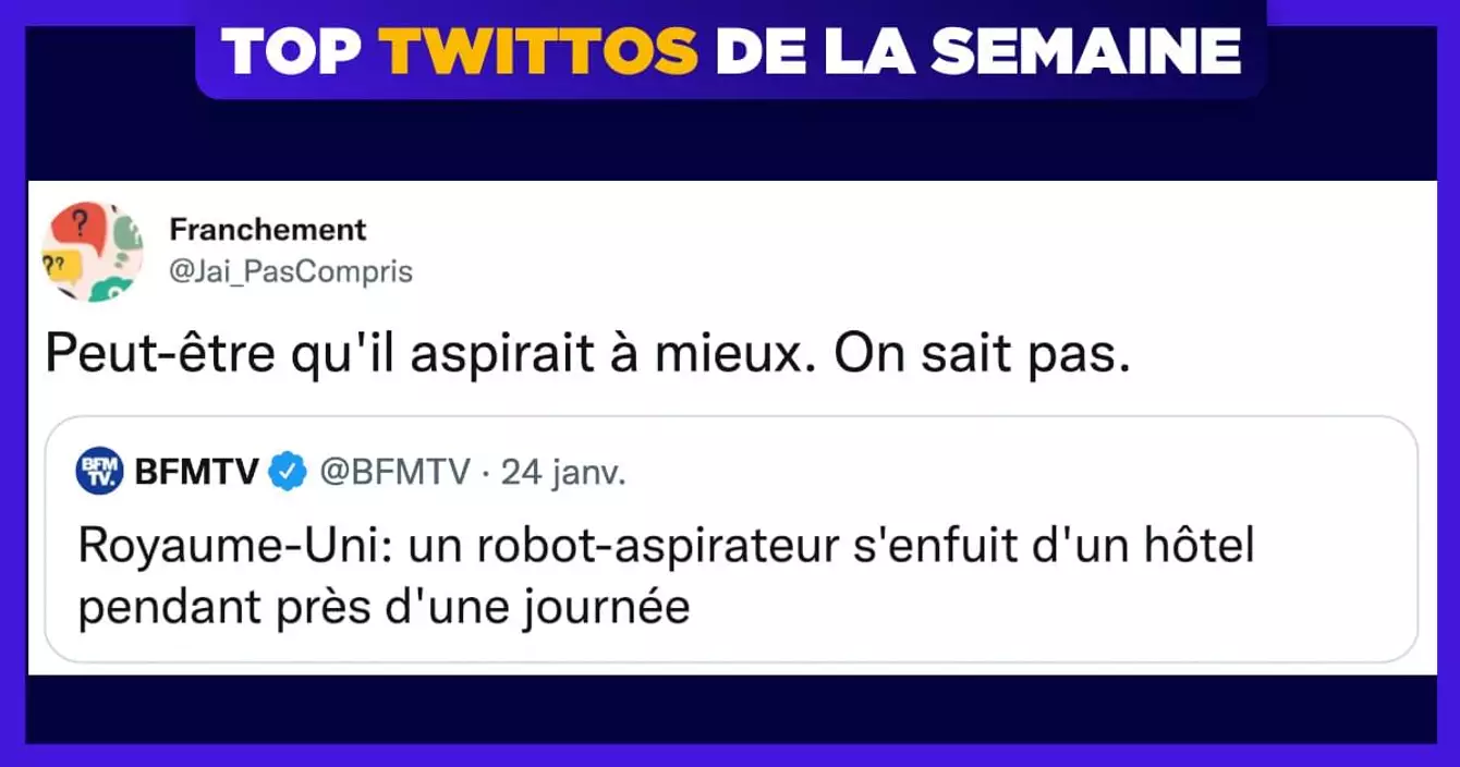 Salut les ptits potes, c'est l'heure du top tweeeeeeets et aujourd'hui, c'est au tour de @Jai_PasCompris. Si tu n'aimes pas les jeux de mots, c'est le moment de quitter ce site (et de ne plus jamais revenir) parce que c'est tout ce qu'on va te proposer aujourd'hui. Passe une belle journée et n'oublie pas : le meilleur film de tous les temps, c'est le cellophane.