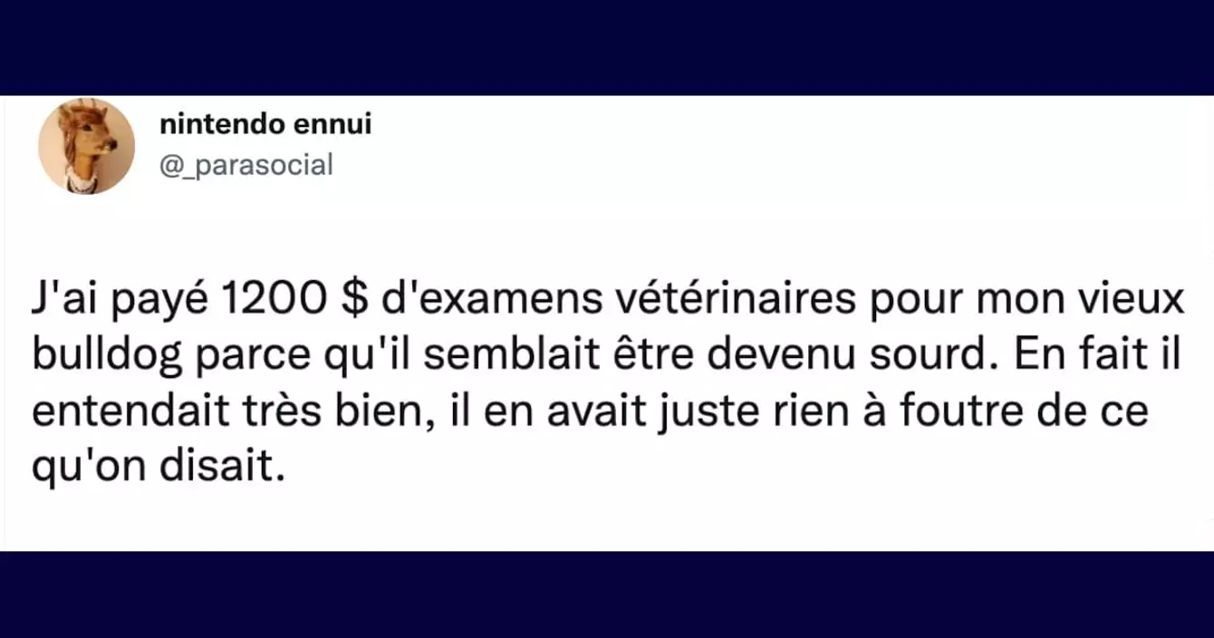 J'ai payé 1200 $ pour faire passer plein d'examens à mon vieux bulldog parce qu'il me semblait qu'il était devenu sourd. En fait elle entendait très bien, elle en avait juste rien à foutre de ce qu'on disait.