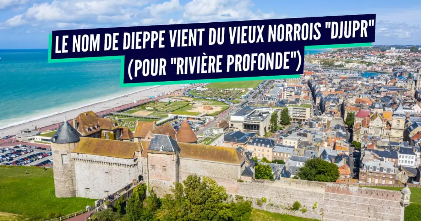 C'est quand les Vikings débarquèrent en 910 à l'embouchure de la Tella, un fleuve qui se jette dans la mer, qu'ils surnommèrent le coin Djupr, qui veut dire « rivière profonde ». Depuis c'est resté et Djupr est devenu Dieppe.